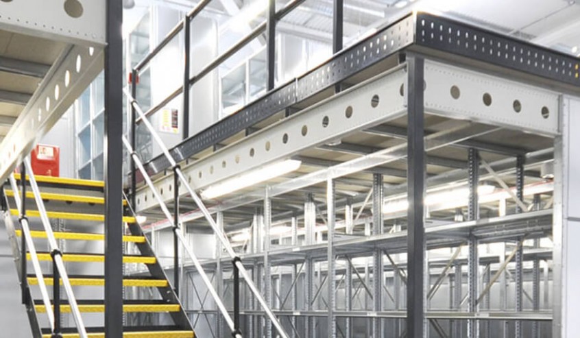 Shelving built into two or more levels. The bottom shelving is the support for the mezzanine floor..